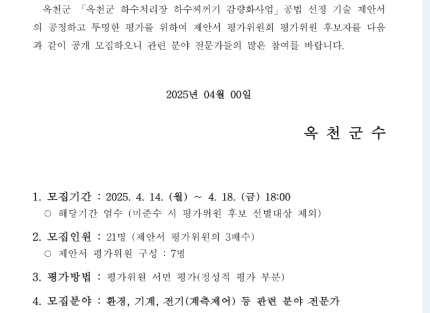 옥천군 하수처리장 하수찌꺼기 감량화사업 제안서 평가위원회 평가위원 후보자 모집 공고2025-04-10 ..
