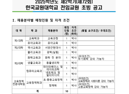 [4/30 마감] 2025학년도 제2학기(제72회) 한국교원대학교 전임교원 초빙 공고_10명 모집