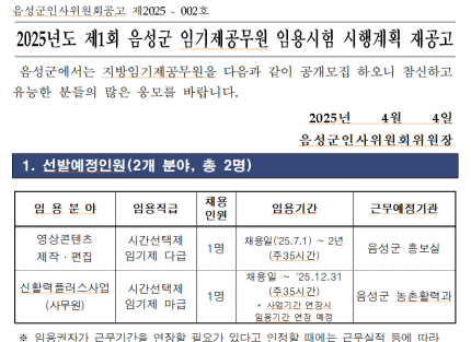 [4/18 마감] 2025년도 제1회 음성군 임기제공무원 임용시험 시행계획 재공고_○ 모집분야 : 영상콘텐…