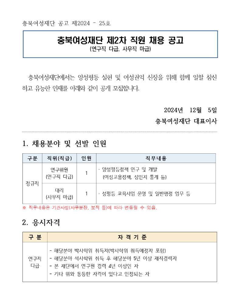 공공채용 [12/16 마감] 충북여성재단 제2차 직원 채용 공고(연구직다급, 사무직마급)