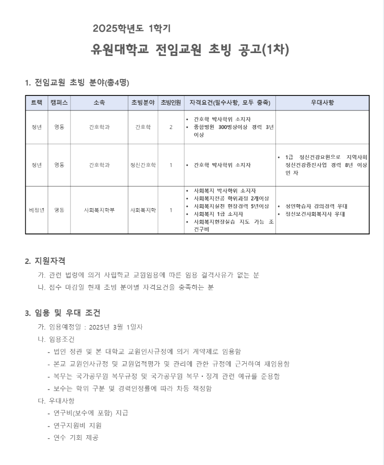 공공채용 [1/10 마감] 2025학년도 유원대학교 전임교원 초빙 공고(1차)
