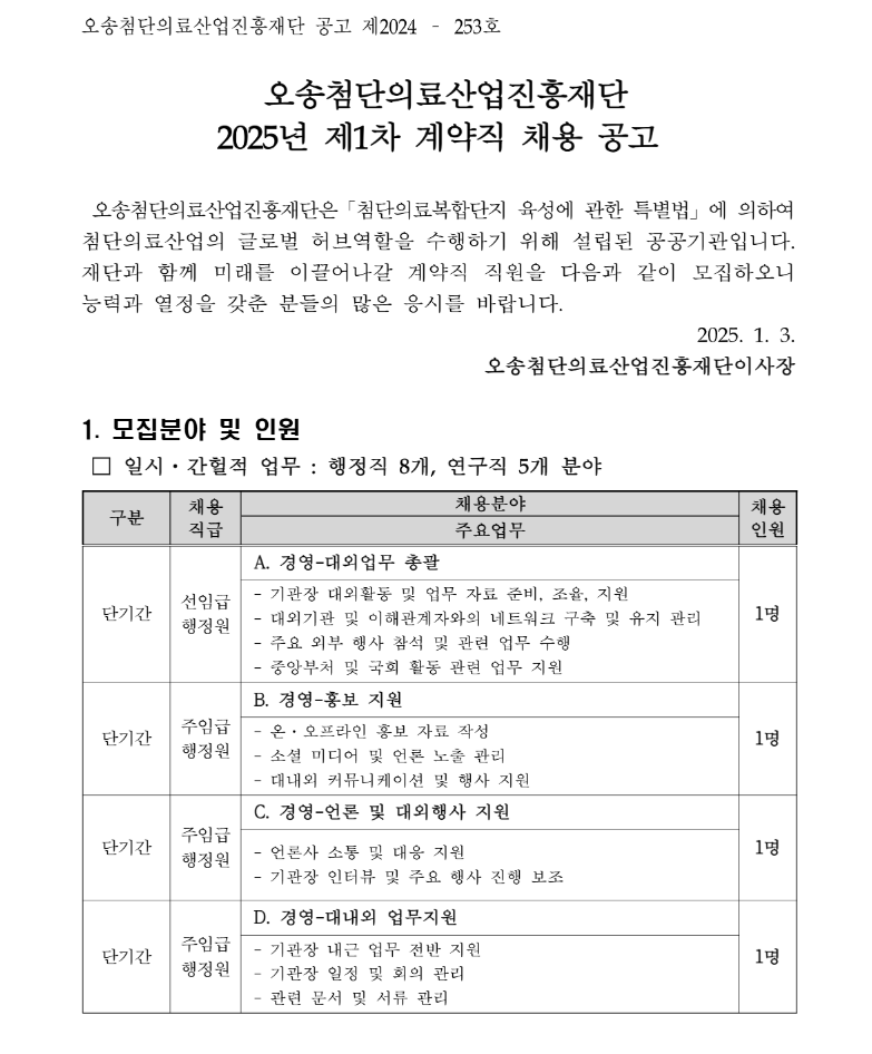 공공채용 [1/17 마감] 오송첨단의료산업진흥재단 2025년 1차 계약직 채용 공고_총 18명