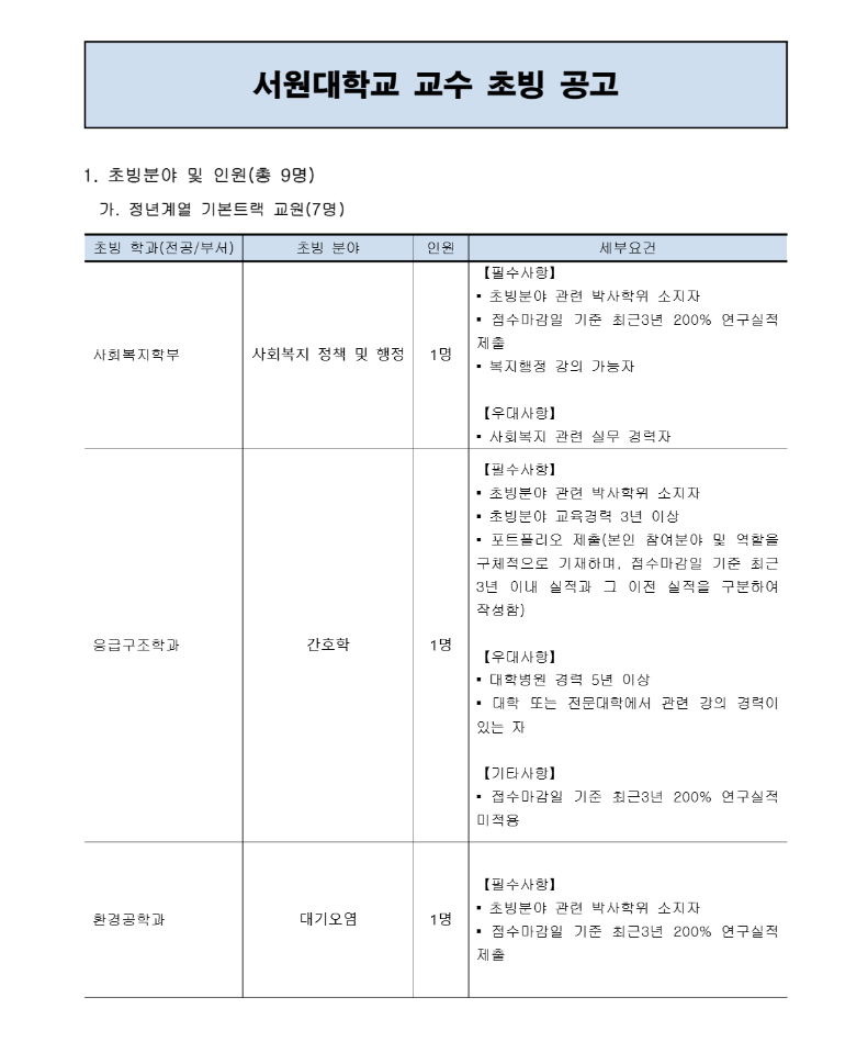 환경공학과 | 대기오염 | 1명 | 【필수사항】 ▪ 초빙분야 관련 박사학위 소지자 ▪ 접수마감일 기준 최근3년 200% 연구실적 제출 |