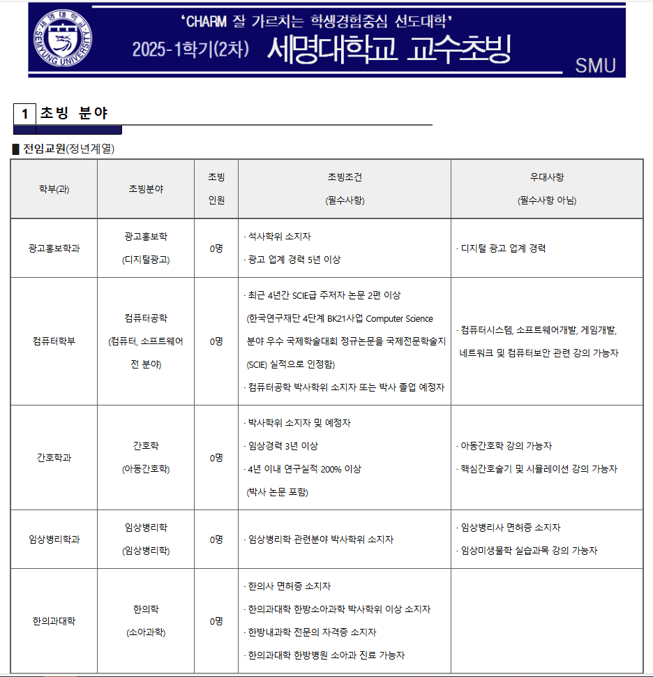 공공채용 [1/23 마감] 세명대학교 2025-1학기(2차) 교수초빙