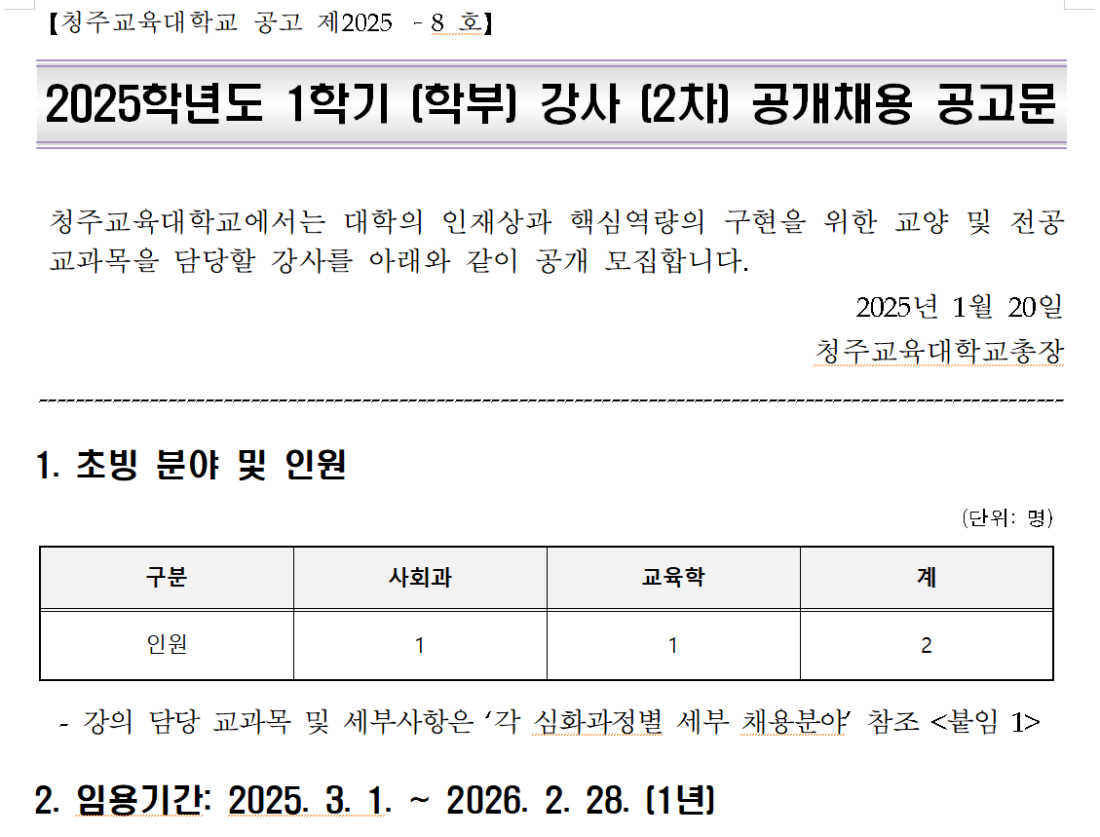 공지 [1/24 마감] 청주교육대학교 2025학년도 1학기 (학부) 강사 (2차) 공개채용 공고_사회과 1명, 교육학 1명