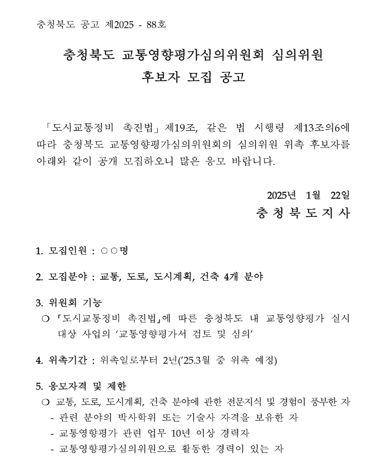 공공채용 [2/5 마감] 충청북도 교통영향평가심의위원회 심의위원 후보자 모집 공고_모집인원 : ○○명_모집분야 : 교통, 도로, 도…