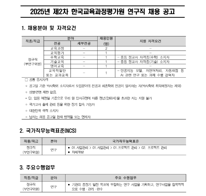 공공채용 [9/26 마감] 2025년 제2차 한국교육과정평가원 연구직 채용 공고_7명 모집