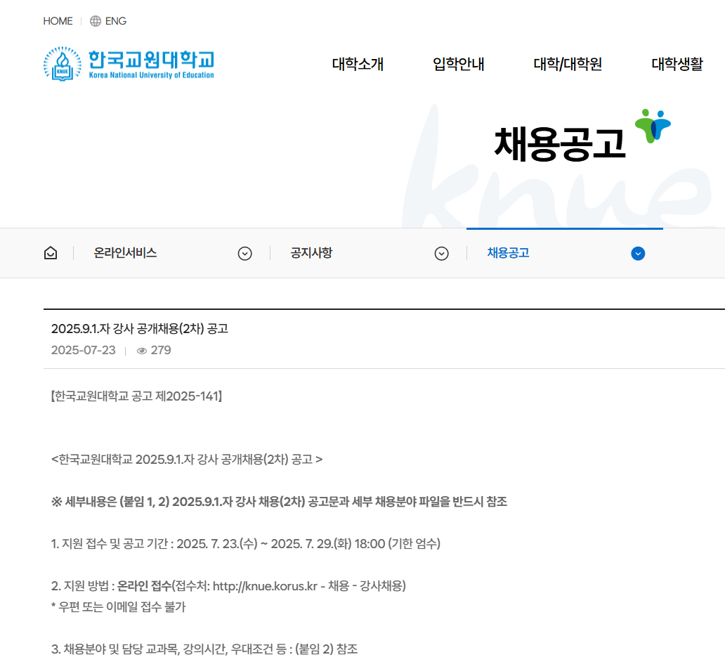 공공채용 [7/29 마감] 한국교원대학교 2025.9.1.자 강사 공개채용(2차) 공고_총 25명 모집