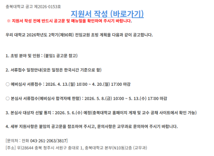 [4/20 마감] 충북대학교 2026학년도 2학기(제90회) 전임교원 초빙 공고