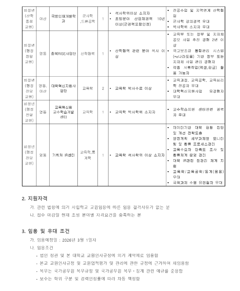 비정년 (행정전담교원) | 영동 | 충북RISE사업단 | 산학협력 | 1 | 산학협력 관련 분야 석사 이상 |