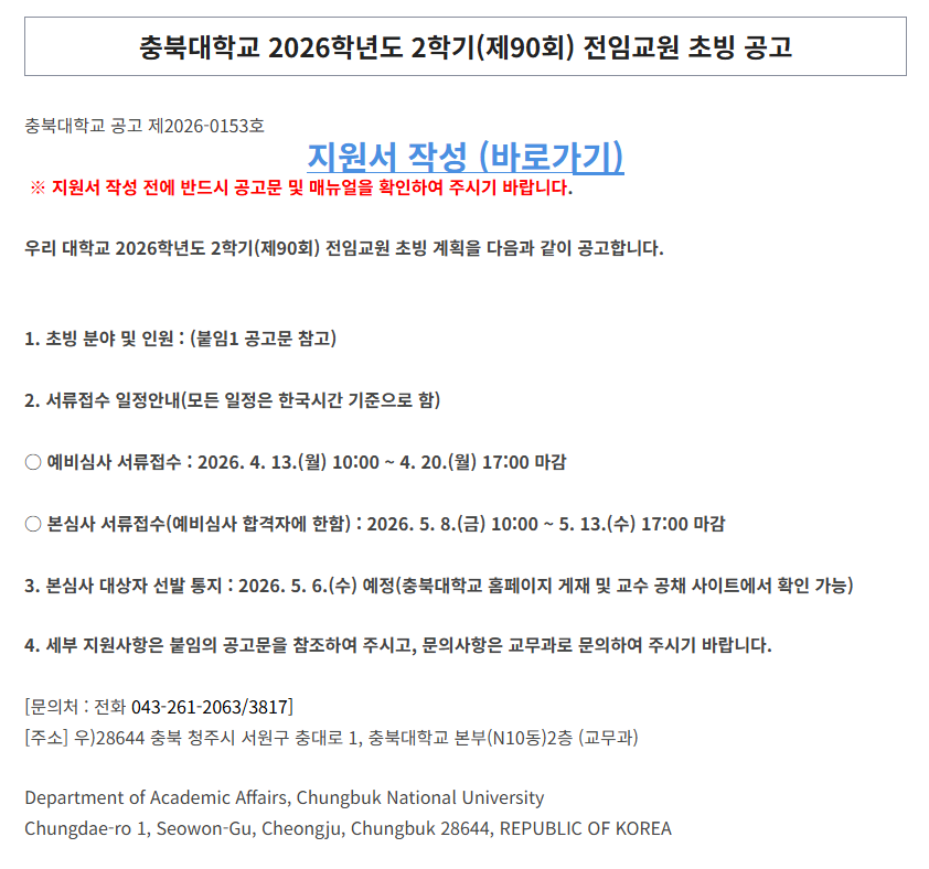 공공채용 [4/20 마감] 충북대학교 2026학년도 2학기(제90회) 전임교원 초빙 공고