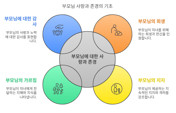 부모님은 우리의 첫 번째 스승이자, 인생의 길잡이입니다. 그들은 우리가 어려움을 겪을 때마다 곁에서 지지해 주고, 올바른 길로 나아갈 수 있도록 도와줍니다. 이러한 사랑과 지지는 우리가 성장하는 데 있어 필수적인 요소입니다. 부모님에 대한 존경은 그들의 노력과 희생을 인정하는 것이며, 이는 우리가 성숙한 인격체로 성장하는 데 중요한 역할을 합니다.