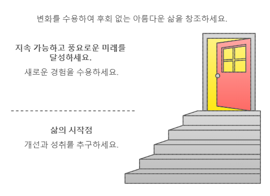 2025년 봄은 후회 없는 아름다운 삶을 시작하기에 완벽한 시점입니다. 목표를 설정하고, 긍정적인 사고방식을 유지하며, 지속 가능한 삶을 실천하고, 새로운 경험에 도전함으로써 더 나은 미래를 만들어 나갈 수 있습니다. 지금 이 순간부터 작은 변화들을 시작해보세요.