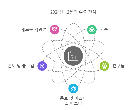 2024년 12월은 다양한 사람들과의 만남을 통해 소중한 시간을 보낼 수 있는 기회입니다. 가족, 친구, 동료, 멘토, 그리고 새로운 사람들과의 만남을 통해 서로의 삶에 긍정적인 영향을 미치고, 새로운 시작을 준비해보세요.