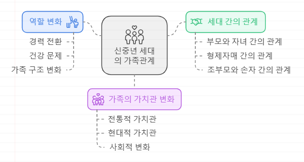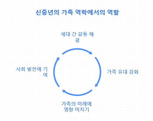 신중년 세대는 가족 내에서 다양한 역할을 수행합니다. 자녀의 교육과 진로에 대한 책임을 지는 동시에, 노부모의 돌봄 역할도 맡게 됩니다. 이로 인해 신중년은 '중간 세대'로서의 부담을 느끼며, 가족 내에서의 의사결정 과정에서도 중요한 위치를 차지하게 됩니다.