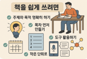 • 책을 한 번에 쓰려 하면 어렵습니다. **큰 틀(목차)**을 먼저 잡으세요.