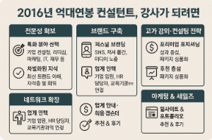 - 특화 분야 선택: 기업 컨설팅, 리더십, 마케팅, IT, 재무 등 수요가 높은 분야를 선택하세요.