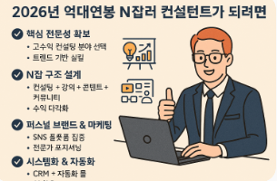 억대 연봉을 목표로 하는 2026년 N잡러(다중 직업) 컨설턴트가 되려면 전략적으로 접근해야 합니다. 핵심은 전문성 + 브랜드 + 시스템화입니다. 아래 단계별 로드맵을 제안할게요.