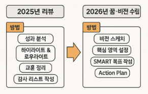 2025년 리뷰와 2026년 꿈·비전 수립은 개인과 조직 모두에게 매우 중요한 과정입니다. 효과적으로 진행하려면 다음과 같은 단계적 접근을 추천합니다: