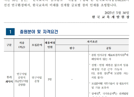 [6/16 마감] 한국교육개발원 2025년도 제5차 직원 채용(연구사업운영직)_3명 모집