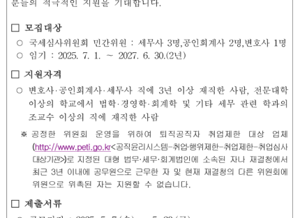공지사항국세심사위원회 민간위원 공개모집 안내작성자 운영자 작성일자 2025.05.08. ..