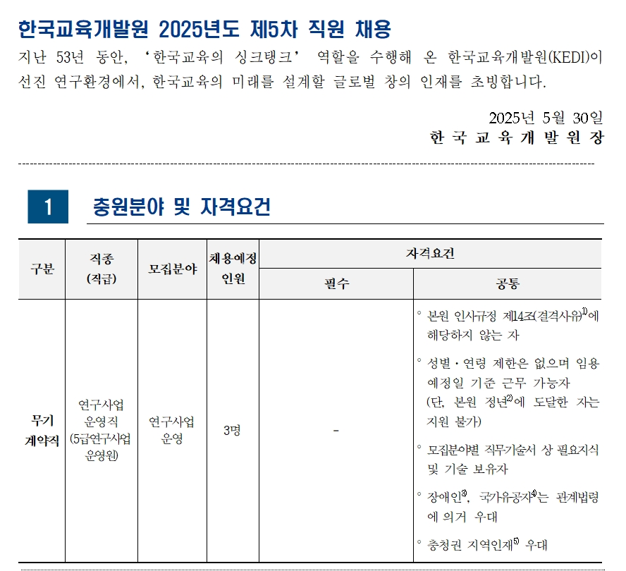 공공채용 [6/16 마감] 한국교육개발원 2025년도 제5차 직원 채용(연구사업운영직)_3명 모집