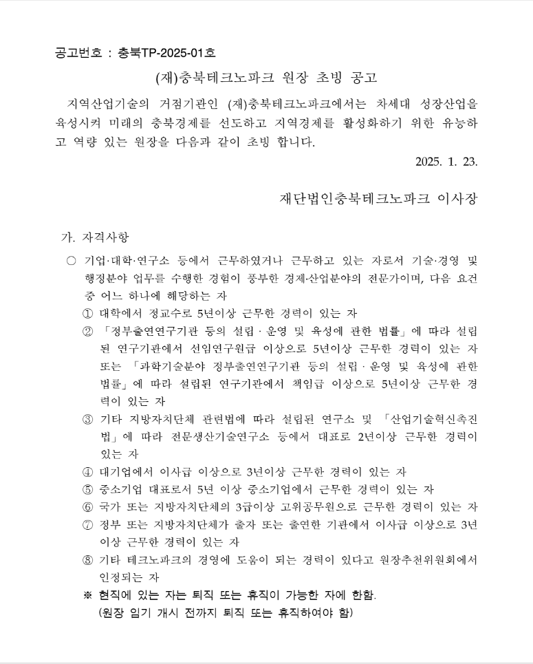 (재)충북테크노파크 원장 초빙 공고 상세보기 < 채용정보 < 알림마당 < 충북테크노파크