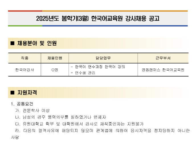 기타 자세한 사항은 한국어교육원 강사채용 공고문을 확인하시기 바랍니다.