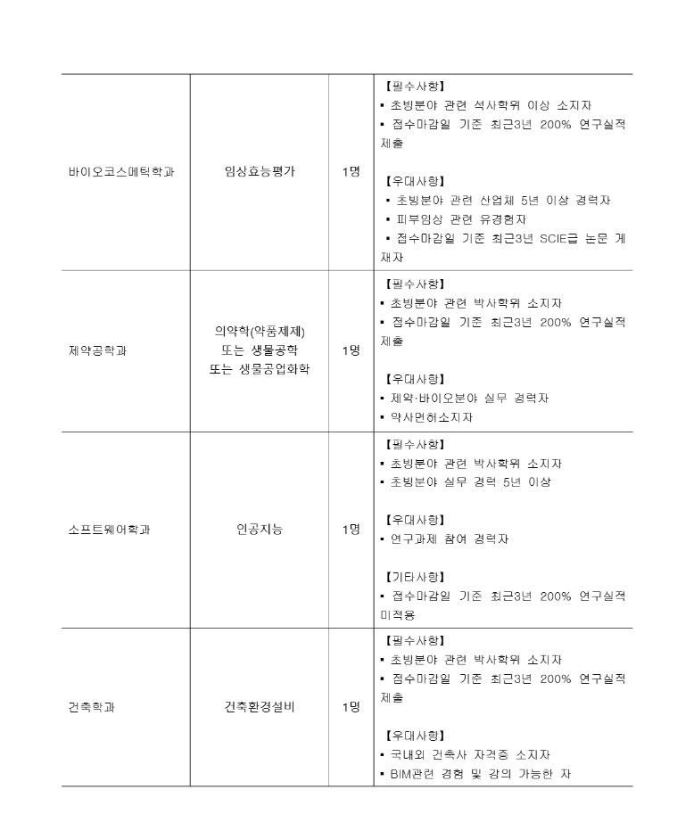 바이오코스메틱학과 | 임상효능평가 | 1명 | 【필수사항】 ▪ 초빙분야 관련 석사학위 이상 소지자 ▪ 접수마감일 기준 최근3년 200% 연구실적 제출