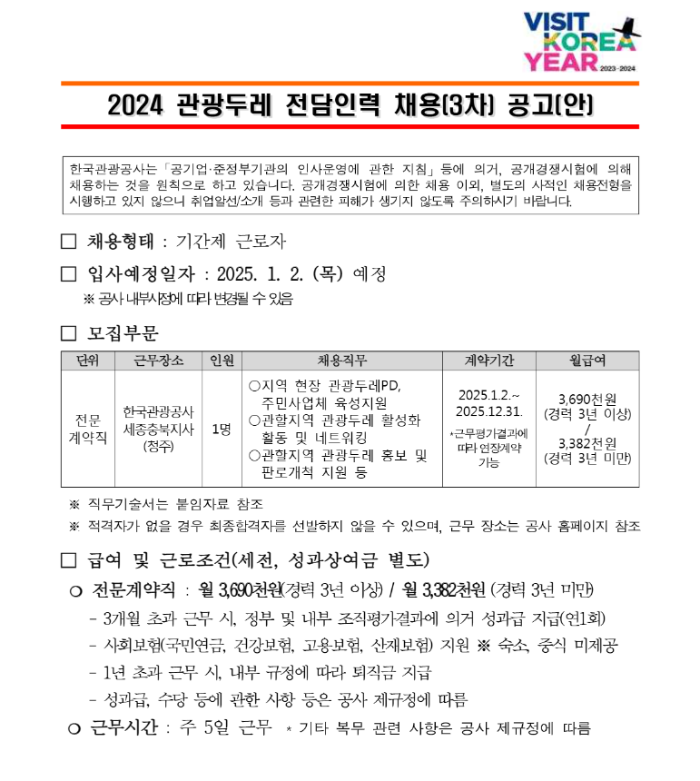 전문 계약직 | 한국관광공사 세종충북지사 (청주) | 1명 | ○지역 현장 관광두레PD, 주민사업체 육성지원 ○관할지역 관광두레 활성화 활동 및 네트워킹 ○관할지역 관광두레 홍보 및 판로개척 지원 등 | 2025.1.2.~ 2025.12.31.