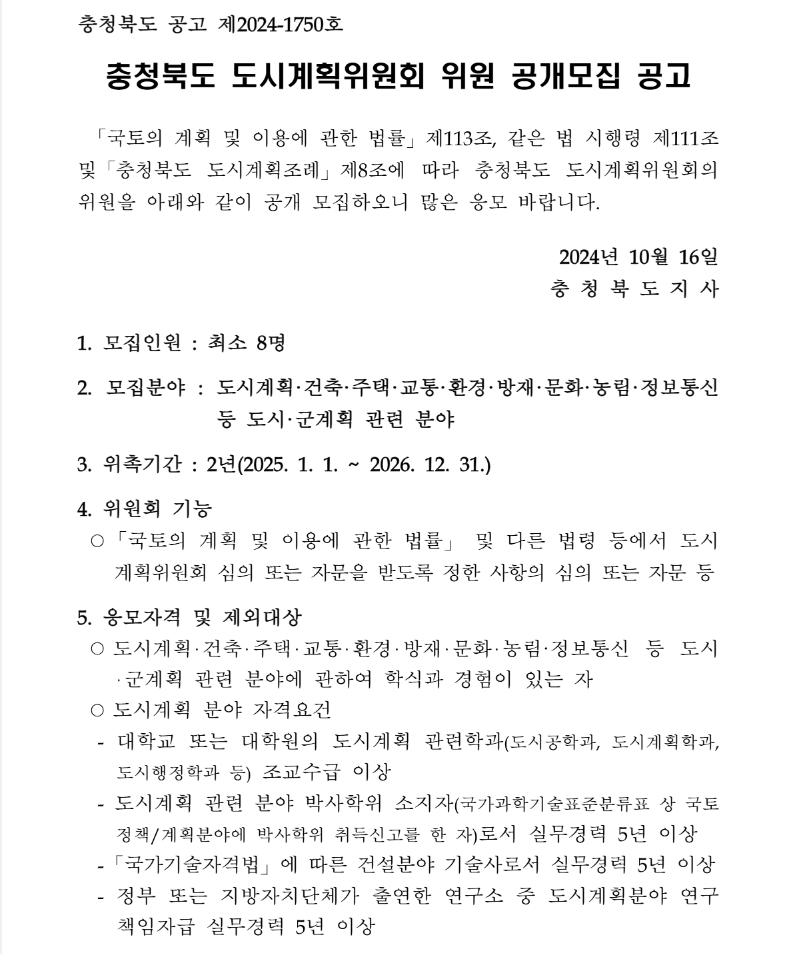 | 내용 | 「국토의 계획 및 이용에 관한 법률」제113조, 같은 법 시행령 제111조 및「충청북도 도시계획조례」제8조에 따라 충청북도 도시계획위원회의 위원을 아래와 같이 공개 모집하오니 많은 응모 바랍니다. 1. 모집인원 : 최소 8명 2. 모집분야 : 도시계획·건축·주택·교통·환경·방재·문화·농림·정보통신 등 도시·군계획 관련 분야 3. 위촉기간 : 2년(2025. 1. 1. ~ 2026. 12. 31.) 4. 위원회 기능 ○「국토의 계획 및 이용에 관한 법률」 및 다른 법령 등에서 도시계획위원회 심의 또는 자문을 받도록 정한 사항의 심의 또는 자문 등 5. 응모자격 및 제외대상 ○도시계획‧건축‧주택‧교통‧환경‧방재‧문화‧농림·정보통신 등 도시‧군계획 관련 분야에 관하여 학식과 경험이 있는 자 ○도시계획 분야 자격요건 - 대학교 또는 대학원의 도시계획 관련학과(도시공학과, 도시계획학과, 도시행정학과 등) 조교수급 이상 - 도시계획 관련 분야 박사학위 소지자(국가과학기술표준분류표 상 국토정책/계획분야에 박사학위 취득신고를 한 자)로서 실무경력 5년 이상 -「국가기술자격법」에 따른 건설분야 기술사로서 실무경력 5년 이상 - 정부 또는 지방자치단체가 출연한 연구소 중 도시계획분야 연구책임자급 실무경력 5년 이상 ○위원회 심의 및 자문에 적극적으로 참여(매월 마지막 목요일)할 수 있는 자 ○제외대상 - 건축사, 기술사 등 민간전문가 중 도내 현업 종사자(다만, 타 지역 현업 종사자 위촉이 곤란한 경우는 위촉 가능) - 道의 다른 위원회 5개 또는 타 지방자치단체의 도시계획위원회 3개를 초과하여 위촉된 자(다만, 전문분야 부족 등 특별한 사유가 있는 경우는 위촉 가능) -「지방공무원법」제31조의 결격사유에 해당하는 자 또는 기타 응모자격 등에 부적합한 자 6. 응모기간 및 접수 ○ 기 간 : 2024. 10. 16.(수) ~ 2024. 10. 30.(수) ○ 접 수 처 : 충북도청 균형발전과(도시계획팀, ☏ 043-220-4133) ○ 접수방법 : 방문(토·일 제외) 또는 우편, 이메일(csh9403@korea.kr) ※ 주소 : 충청북도 청주시 상당구 상당로 82(문화동) 충북도청 균형발전과 도시계획팀 7. 심사 및 통지 ○ 적격자 심사 선정 후 홈페이지 게시 8. 제출서류 ○ 지원서 및 개인정보 제공 동의서(붙임 서식) 각 1부 ○ 각종 자격을 입증할 수 있는 서류(재직증명서, 자격증명서, 학위증 사본, 기관 및 단체장 추천서 등) 9. 기타사항 ○ 제출된 서류는 반환하지 않으며, 기재된 내용이 사실과 다른 경우에는 위촉을 취소할 수 있음 ○기타 자세한 내용은 충청북도 균형발전과 도시계획팀으로 문의(043-220-4133) 하시기 바랍니다. | ||