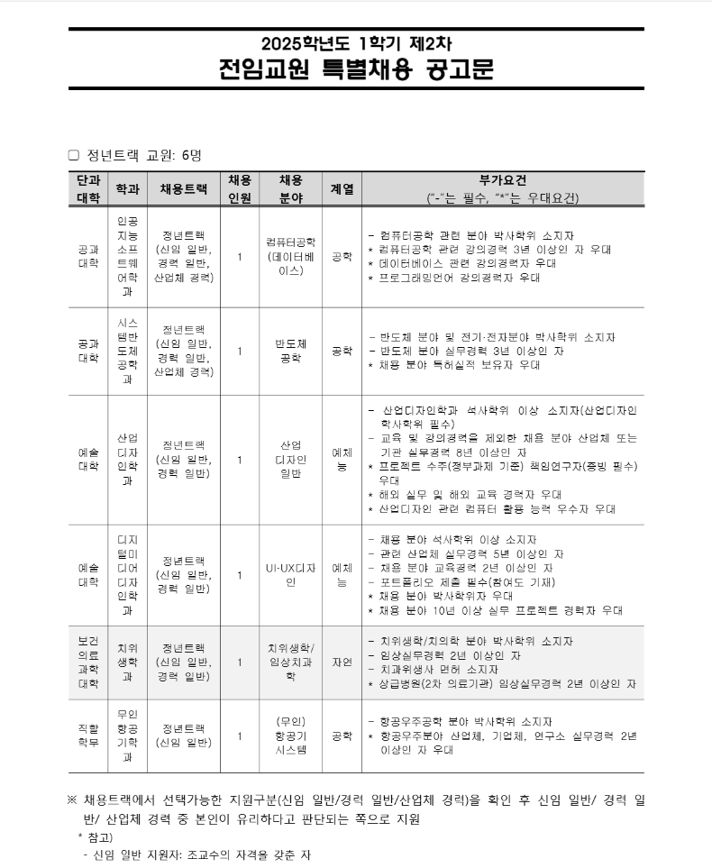 ▢ 정년트랙 교원: 6명 단과 대학 | 학과 | 채용트랙 | 채용인원 | 채용 분야 | 계열 | 부가요건 (“-”는 필수, “*”는 우대요건) | 공과대학 | 인공지능소프트웨어학과 | 정년트랙 (신임 일반, 경력 일반, 산업체 경력) | 1 | 컴퓨터공학(데이터베이스) | 공학 | - 컴퓨터공학 관련 분야 박사학위 소지자 * 컴퓨터공학 관련 강의경력 3년 이상인 자 우대 * 데이터베이스 관련 강의경력자 우대 * 프로그래밍언어 강의경력자 우대 | 공과대학 | 시스템반도체공학과 | 정년트랙 (신임 일반, 경력 일반, 산업체 경력) | 1 | 반도체 공학 | 공학 | - 반도체 분야 및 전기·전자분야 박사학위 소지자 - 반도체 분야 실무경력 3년 이상인 자 * 채용 분야 특허실적 보유자 우대 | 예술대학 | 산업디자인학과 | 정년트랙 (신임 일반, 경력 일반) | 1 | 산업 디자인 일반 | 예체능 | - 산업디자인학과 석사학위 이상 소지자(산업디자인 학사학위 필수) - 교육 및 강의경력을 제외한 채용 분야 산업체 또는 기관 실무경력 8년 이상인 자 * 프로젝트 수주(정부과제 기준) 책임연구자(증빙 필수) 우대 * 해외 실무 및 해외 교육 경력자 우대 * 산업디자인 관련 컴퓨터 활용 능력 우수자 우대 | 예술대학 | 디지털미디어디자인학과 | 정년트랙 (신임 일반, 경력 일반) | 1 | UI·UX디자인 | 예체능 | - 채용 분야 석사학위 이상 소지자 - 관련 산업체 실무경력 5년 이상인 자 - 채용 분야 교육경력 2년 이상인 자 - 포트폴리오 제출 필수(참여도 기재) * 채용 분야 박사학위자 우대 * 채용 분야 10년 이상 실무 프로젝트 경력자 우대 | 보건의료과학대학 | 치위생학과 | 정년트랙 (신임 일반, 경력 일반) | 1 | 치위생학/임상치과학 | 자연 | - 치위생학/치의학 분야 박사학위 소지자 - 임상실무경력 2년 이상인 자 - 치과위생사 면허 소지자 * 상급병원(2차 의료기관) 임상실무경력 2년 이상인 자 | 직할학부 | 무인항공기학과 | 정년트랙 (신임 일반) | 1 | (무인) 항공기 시스템 | 공학 | - 항공우주공학 분야 박사학위 소지자 * 항공우주분야 산업체, 기업체, 연구소 실무경력 2년 이상인 자 우대 |
