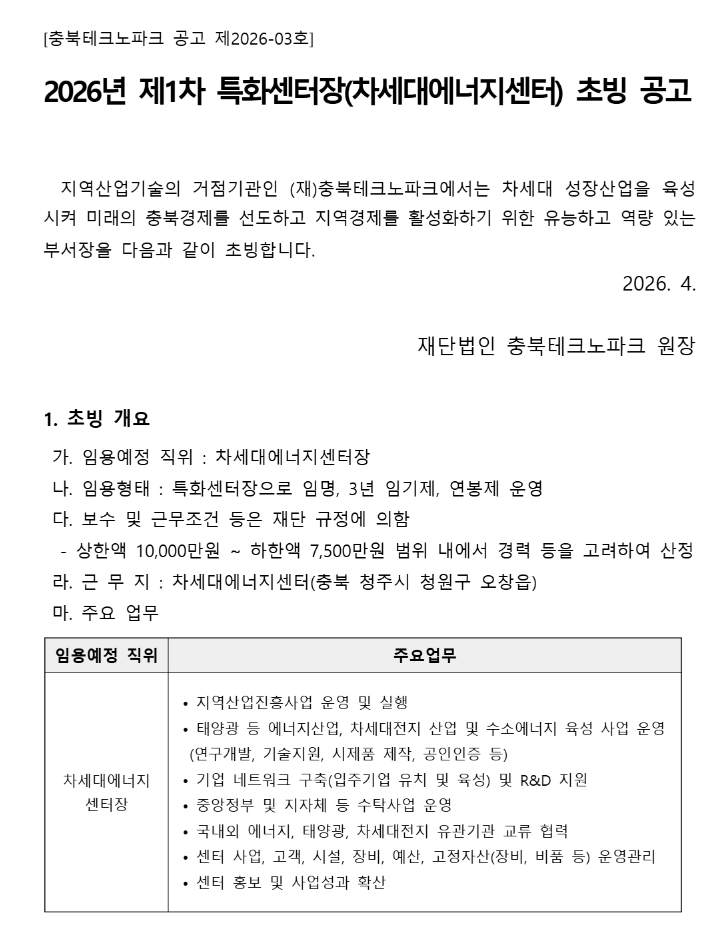 공공채용 [4/30 마감] 충북테크노파크 2026년 제1차 특화센터장(차세대에너지센터) 초빙 공고_연봉 7,500만원~1억원