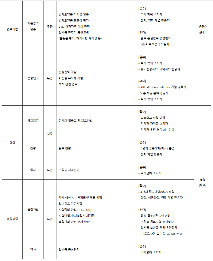 | 연구개발 | 신제형 연구 | 무관 | ETC 제제연구 ETC 공정개발연구 CTD 등 허가자료 작성 신규 기술과제 검토 및 발굴 | [필수] - 석사 학위 소지자 - 화학, 생물, 약학 계열 전공자 [우대] - CTD 등 허가자료 작성 유경험자 - 경구제, 외용제 DDS 기술개발 유경험자 | 연구소 (용인) |