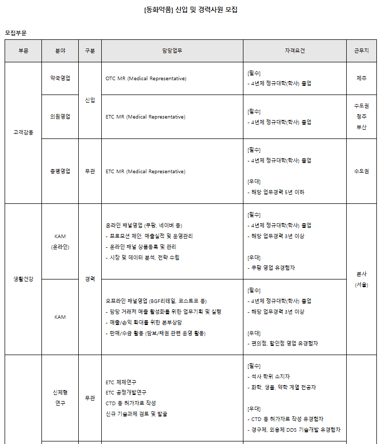 [동화약품] 신입 및 경력사원 모집