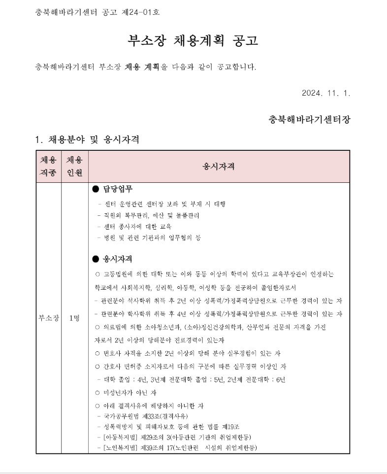 ● 담당업무 - 센터 운영관련 센터장 보좌 및 부재 시 대행 - 직원의 복무관리, 예산 및 물품관리 - 센터 종사자에 대한 교육 - 병원 및 관련 기관과의 업무협의 등 ● 응시자격 ○ 고등법원에 의한 대학 또는 이와 동등 이상의 학력이 있다고 교육부장관이 인정하는 학교에서 사회복지학, 심리학, 아동학, 여성학 등을 전공하여 졸업한자로서 - 관련분야 석사학위 취득 후 2년 이상 성폭력/가정폭력상담원으로 근무한 경력이 있는 자 - 관련분야 학사학위 취득 후 4년 이상 성폭력/가정폭력상담원으로 근무한 경력이 있는 자 ○ 의료법에 의한 소아청소년과, (소아)정신건강의학과, 산부인과 전문의 자격을 가진 자로서 2년 이상의 당해분야 진료경력이 있는자 ○ 변호사 자격을 소지한 2년 이상의 당해 분야 실무경험이 있는 자 ○ 간호사 면허증 소지자로서 다음의 구분에 따른 실무경력 이상인 자 - 대학 졸업 : 4년, 3년제 전문대학 졸업 : 5년, 2년제 전문대학 : 6년 ○ 미성년자가 아닌 자 ○ 아래 결격사유에 해당하지 아니한 자 - 국가공무원법 제33조(결격사유) - 성폭력방지 및 피해자보호 등에 관한 법률 제19조 - [아동복지법] 제29조의 3(아동관련 기관의 취업제한등) - [노인복지법] 제39조의 17(노인관련 시설의 취업제한등) |