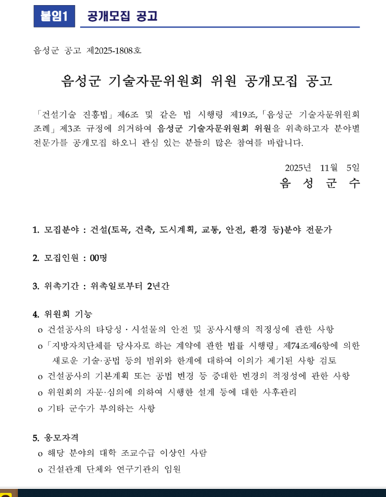 공공채용 [11/20 마감] 음성군 기술자문위원회 위원 공개모집 공고_00명
