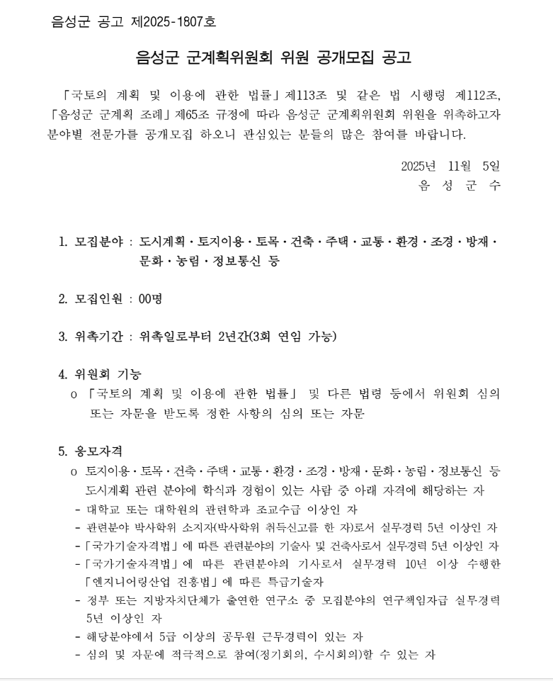 공공채용 [11/20 마감] 음성군 군계획위원회 위원 공개모집 공고_00명