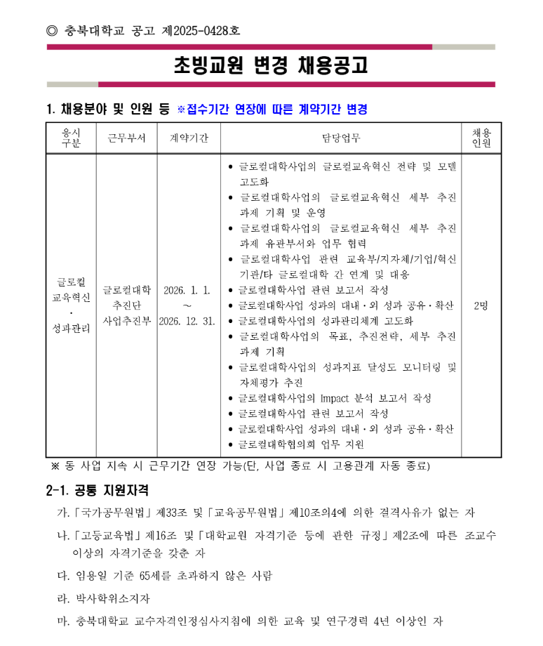 공공채용 [12/8 마감] 충북대학교 초빙교원 채용공고 연장(글로컬대학추진단 사업추진부)_2명_1년 채용_65세 이하