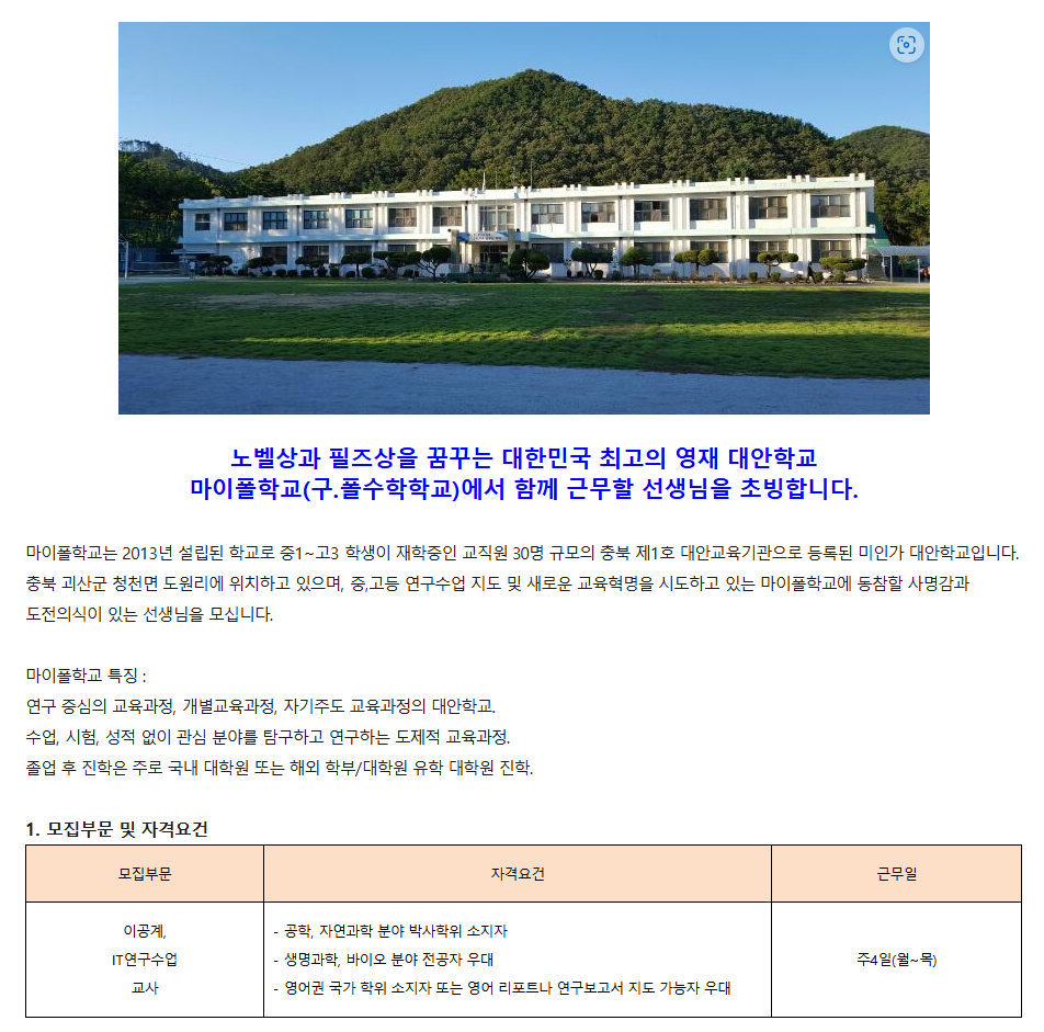 공공채용 [1/25 마감] 마이폴학교 교사 모집(이공계, 생명과학, 바이오)