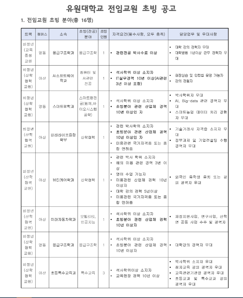 공공채용 [2/3 마감] 2026학년도 유원대학교 전임교원 초빙 공고(3차)_총 16명 모집