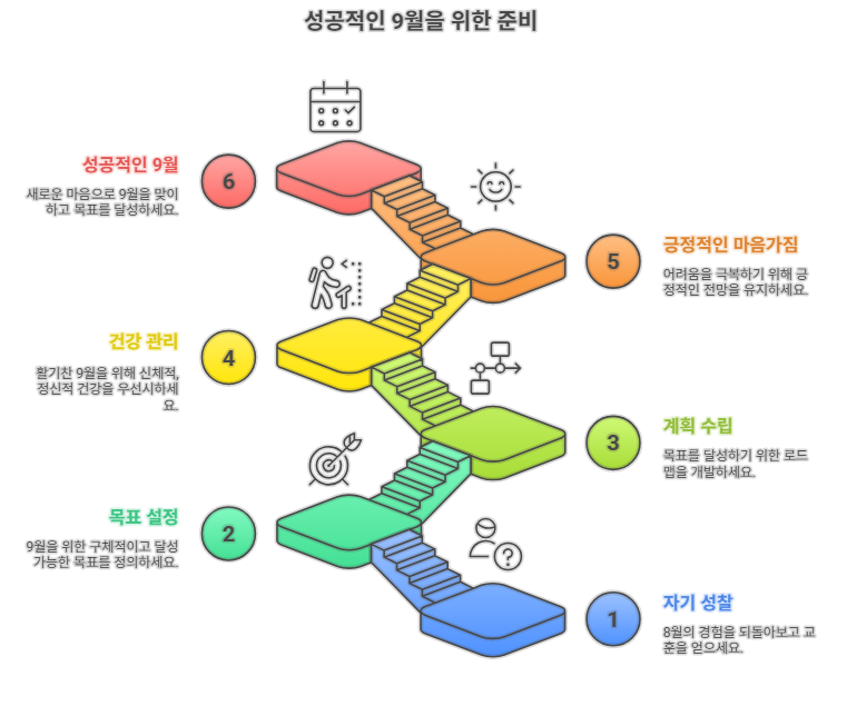 8월의 어려움을 극복하고 9월을 성공적으로 맞이하기 위한 준비는 단순히 계획을 세우는 것 이상입니다. 자신을 돌아보고, 목표를 설정하고, 계획을 수립하고, 건강을 관리하고, 긍정적인 마음가짐을 갖는 모든 과정이 중요합니다. 이 모든 과정을 통해 우리는 더욱 성장하고 발전할 수 있습니다. 다가오는 9월, 새로운 마음으로 힘차게 시작합시다!