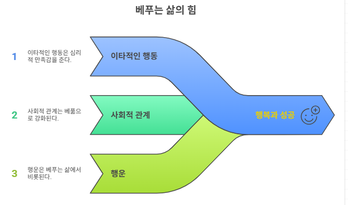 베푸는 삶은 개인의 행복과 성공, 그리고 사회 전체의 발전에 기여하는 가치 있는 삶의 방식입니다. 이타적인 행동은 심리적 만족감, 사회적 관계 강화, 그리고 행운을 불러오는 힘을 지니고 있습니다. 지금부터라도 작은 행동을 통해 베푸는 삶을 실천하고, 긍정적인 변화를 경험해 보시기 바랍니다.