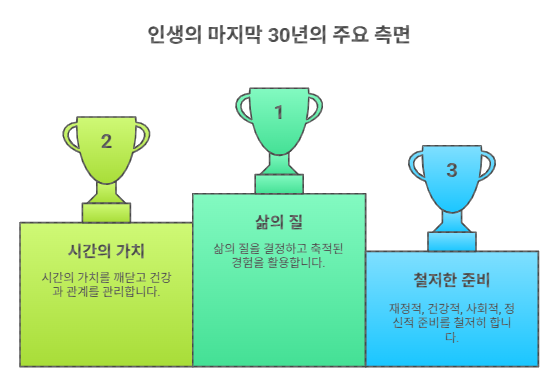 인생 30-30-30 모델에서 마지막 30년은 삶의 질을 결정하고, 축적된 경험과 지혜를 활용하며, 시간의 가치를 깨닫고, 건강과 관계를 관리하는 데 중요한 시기입니다. 재정적, 건강적, 사회적, 정신적 준비를 철저히 하여 성공적인 노년 생활을 누리시길 바랍니다. 마지막 30년은 단순히 삶의 끝자락이 아니라, 새로운 시작이자 인생의 황금기가 될 수 있습니다.