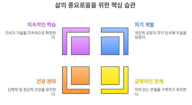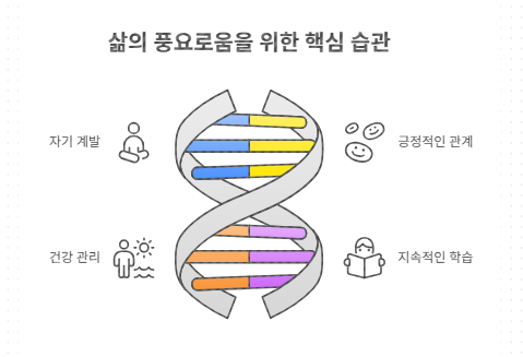 이 네 가지 습관을 꾸준히 실천하면 삶을 더욱 풍요롭고 의미있게 만들 수 있습니다. 작은 변화부터 시작하여 점진적으로 습관을 형성하고, 자신의 삶을 적극적으로 개선해 나가세요.