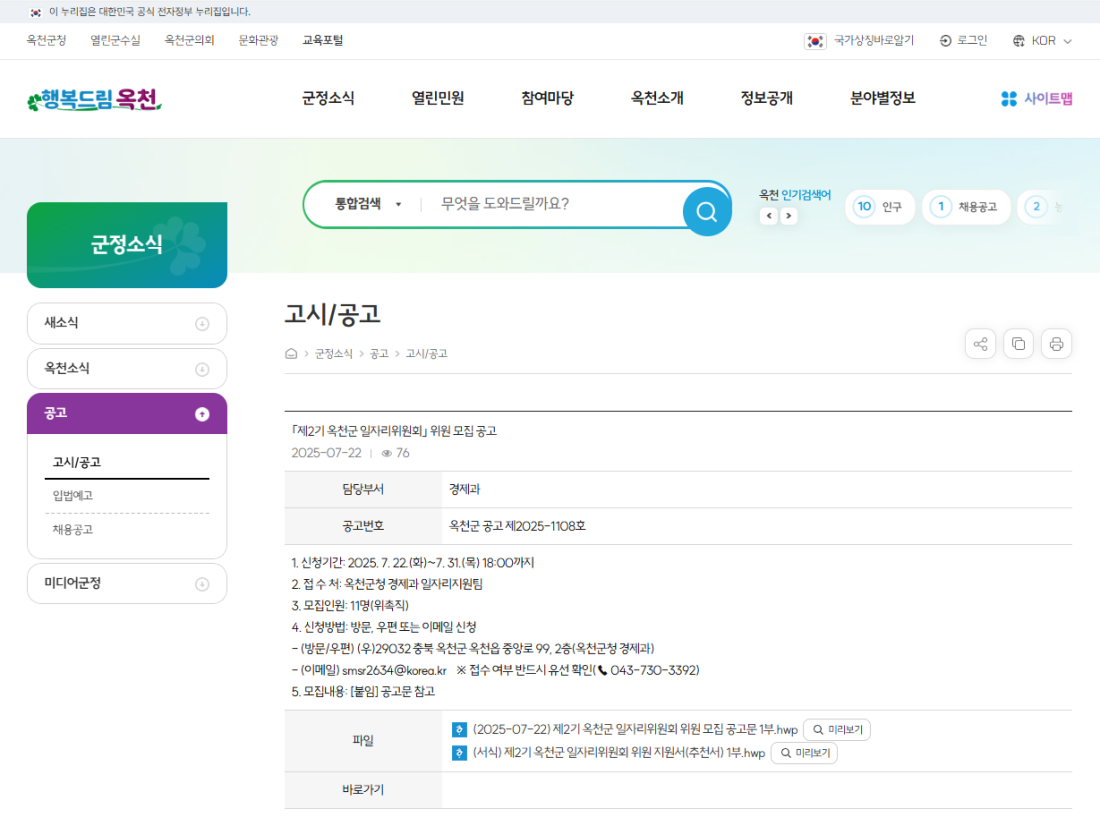 | 공고번호 | 옥천군 공고 제2025-1108호 |