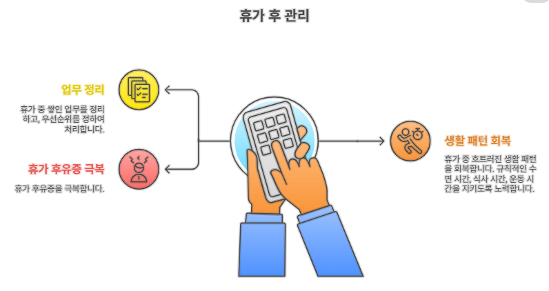 휴가 후에는 피로가 누적될 수 있으므로, 충분한 휴식을 취하여 피로를 해소해야 합니다.