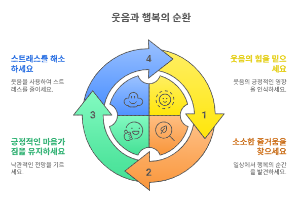 긍정적인 마음: 웃음은 긍정적인 마음을 유지하는 데 도움을 줍니다. 웃는 얼굴은 주변 사람들에게도 긍정적인 에너지를 전달하며, 긍정적인 분위기를 조성합니다.