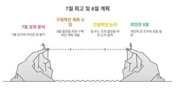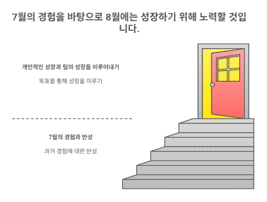 2025년 7월의 경험을 바탕으로 8월에는 더욱 발전된 모습으로 나아갈 수 있도록 노력할 것입니다. 구체적인 목표와 계획을 수립하고, 꾸준히 실천하여 개인적인 성장과 팀의 발전을 동시에 이루어낼 것입니다. 긍정적인 마음과 열정으로 가득 찬 8월을 만들어나가겠습니다.