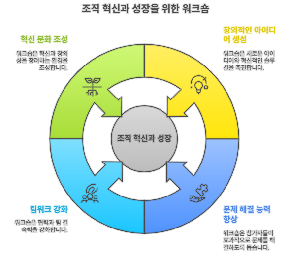 혁신 문화 조성: 워크숍은 조직 전체에 걸쳐 창의성과 혁신을 장려하는 문화를 조성하고 지속적인 성장을 위한 기반을 마련합니다.